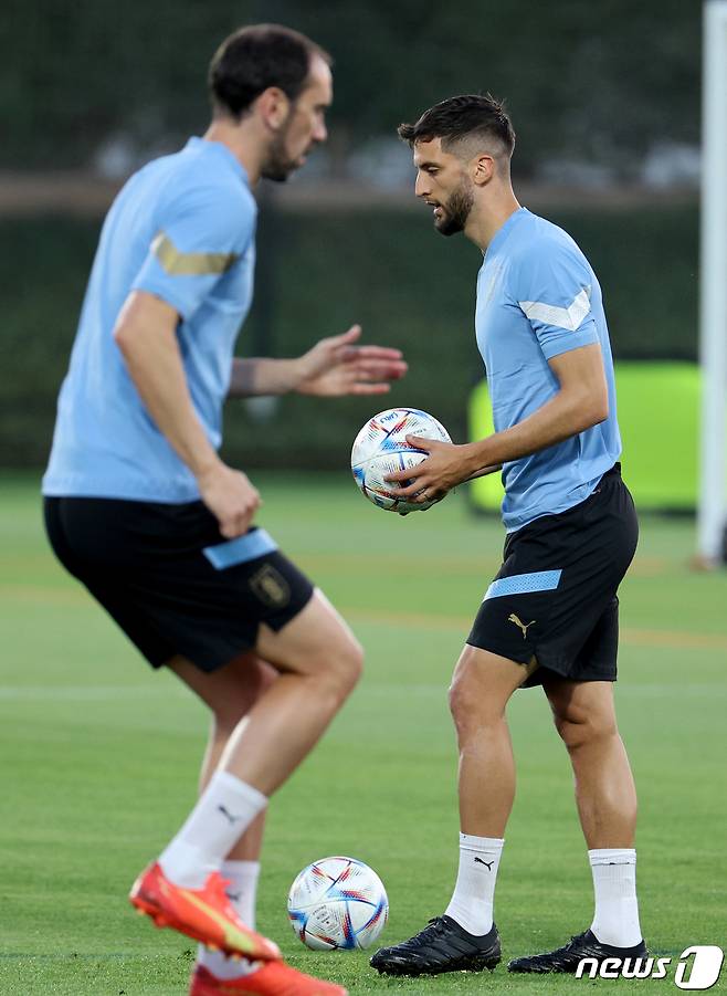 (도하(카타르)=뉴스1) 이광호 기자 = 로드리고 벤탄쿠르를 비롯한 우루과이 축구대표팀 선수들이 2022 카타르 월드컵 조별리그 H조 1차전 한국과의 경기를 하루 앞둔 23일 오후(현지시간) 카타르 도하 알 에르살 트레이닝센터에서 훈련을 하고 있다. 2022.11.23/뉴스1