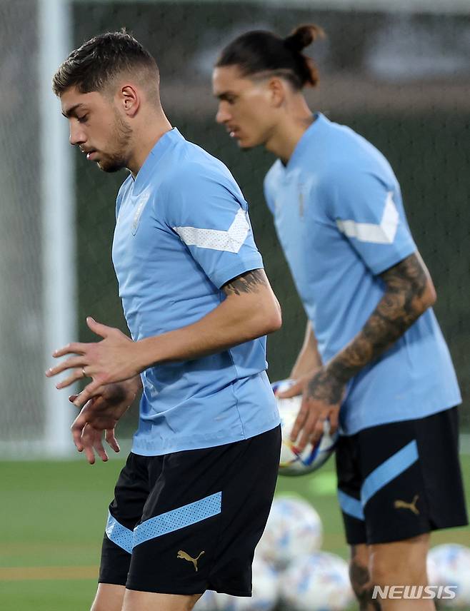 [도하(카타르)=뉴시스] 조성우 기자 = 우루과이 축구대표팀 발베르데, 누녜스가 23일(현지시간) 오후 카타르 도하 알 에르살 트레이닝센터에서 훈련을 하고 있다. 2022.11.23. xconfind@newsis.com