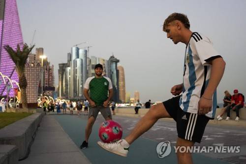 Two men play soccer along the Doha corniche, in Doha, Nov. 23, 2022. (AP Photo/Ashley Landis)