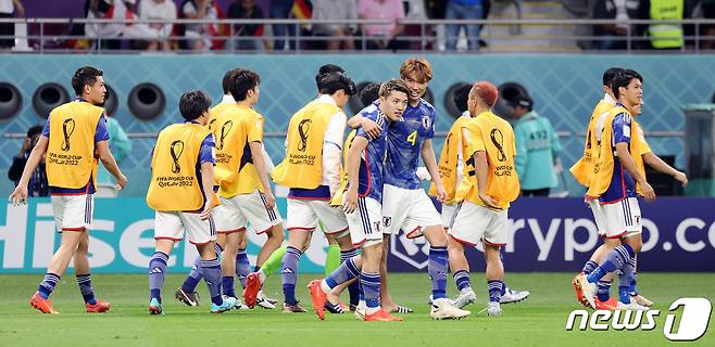 (알라이얀(카타르)=뉴스1) 이동해 기자 = 23일(현지시간) 오후 알라이얀의 할리파 인터내셔널 스타디움에서 열린 2022 카타르 월드컵 E조 일본과 독일의 경기 후반전에서 일본 도안이 동점골을 넣은 뒤 환호하고 있다. 2022.11.23/뉴스1