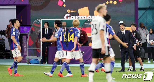 (알라이얀(카타르)=뉴스1) 이동해 기자 = 23일(현지시간) 오후 알라이얀의 할리파 인터내셔널 스타디움에서 열린 2022 카타르 월드컵 E조 일본과 독일의 경기 후반전에서 일본 도안의 동점골에 모리야스 하지메 감독이 미소 짓고 있다. 2022.11.23/뉴스1