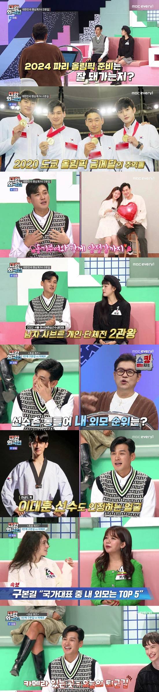 구본길은 "일단 펜싱에서 김준호, 오상욱 선수 인정한다. 태권도계 이대훈 선수는 얼마 전에 은퇴를 해서 자동으로 제가 올라가는 거다. 수영계 황선우 선수도 있다. 매력으로 따지면 육상계 우상혁 선수도 피지컬 좋고, 정환이 형은 한수 아래이지 않나"라고 말해 웃음을 안겼다.