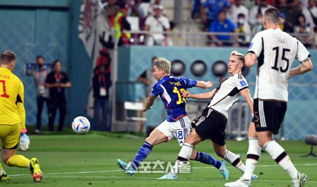 일본 타쿠마가 23일 카타르 도하 칼리파 스타디움에서 열린 2022 FIFA 카타르 월드컵 조별리그 E조 1차전 독일과 경기에서 역전골을 넣고 있다.