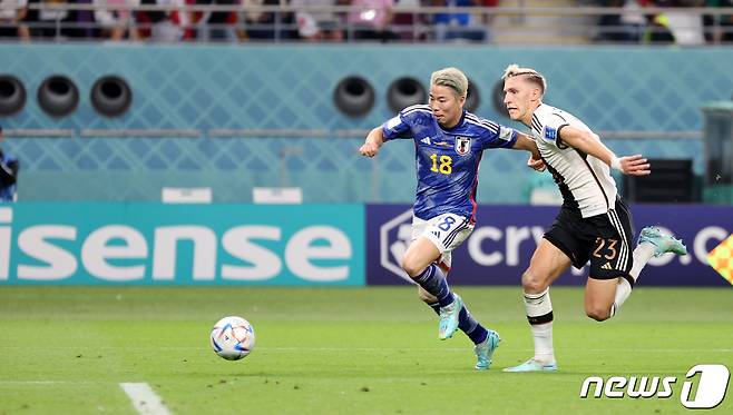 (알라이얀(카타르)=뉴스1) 이동해 기자 = 23일(현지시간) 오후 알라이얀의 할리파 인터내셔널 스타디움에서 열린 2022 카타르 월드컵 E조 일본과 독일의 경기 후반전에서 일본 타쿠마가 역전골을 넣고 있다. 2022.11.23/뉴스1