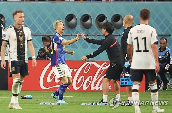 (알라이얀=연합뉴스) 김도훈 기자 = 23일 오후(현지시간) 카타르 알라이얀의 할리파 인터내셔널 스타디움에서 열린 2022 카타르 월드컵 조별리그 E조 독일과 일본의 경기. 일본 아사노 타쿠마(18)가 역전골을 성공시킨 뒤 코치진과 기뻐하고 있다. 2022.11.23