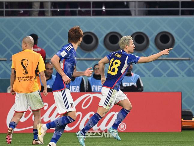 일본 타쿠마가 23일 카타르 도하 칼리파 스타디움에서 열린 2022 FIFA 카타르 월드컵 조별리그 E조 1차전 독일과 경기에서 동점골을 넣은 후 동료들과 환호하고 있다.