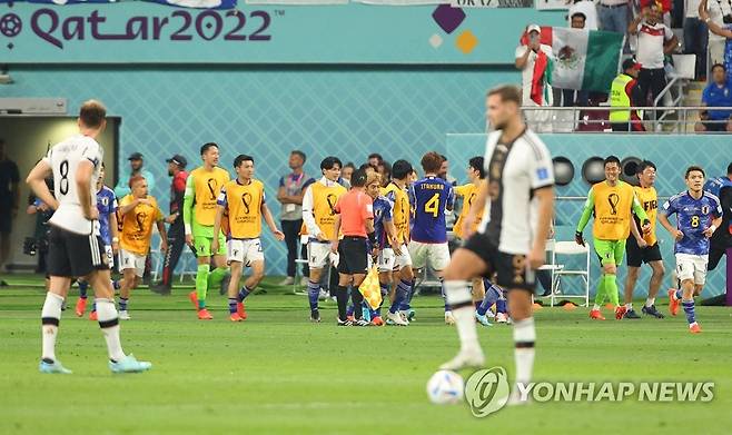 (알라이얀=연합뉴스) 김도훈 기자 = 23일 오후(현지시간) 카타르 알라이얀의 할리파 인터내셔널 스타디움에서 열린 2022 카타르 월드컵 조별리그 E조 독일과 일본의 경기. 일본 아사노 타쿠마(18)가 역전골을 성공시킨 뒤 일본 선수들이 환호하고 있다. 2022.11.23