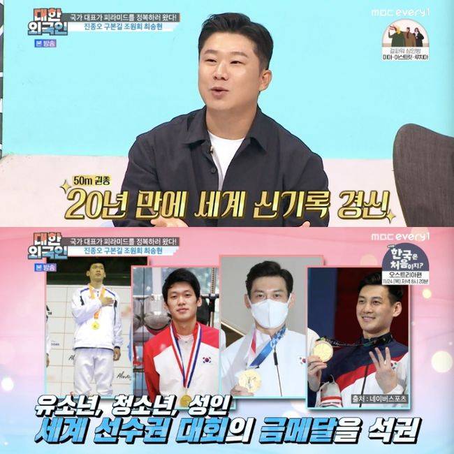 23일 방송된 MBC 에브리원 ‘대한외국인’에서는 ‘나는 국대다’ 특집으로 사격선수 진종오, 펜싱선수 구본길, 전 축구선수 조원희, 그리고 부팀장으로 아나테이너 최송현이 출연했다.