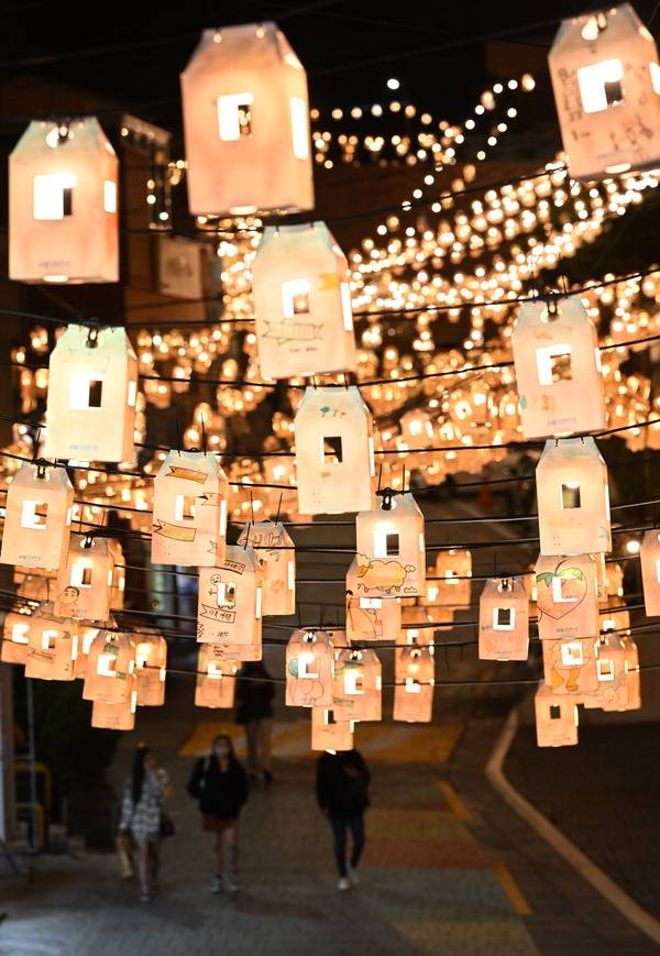 8000개의 등불에 저마다 다른 그림이 그려져 볼거리를 더한다. 지난달 골목축제에 참여한 부산예술고 등 지역 27개 기관과 방문객, 주민 등이 직접 등 만들기 체험 행사를 통해 만든 등을 전시에 활용한 것이다. 감천문화마을주민협의회 김경열 회장은 “초등학생부터 고등학생까지, 감천문화마을을 찾은 관광객이 집등 만들기 체험행사에 참여해 직접 그린 그림이라 더 뜻깊다”고 설명했다.