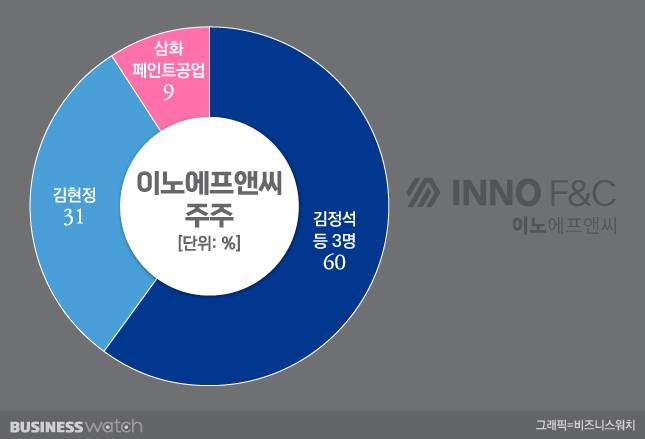 묘한 점은 다음이다. 삼화페인트는 이노에프앤씨 설립 이듬해인 2002년 4월 지분 15%를 매입했다. 이 가운데 6%를 재작년 9월 매각했다. 인수자가 김 회장의 2세 남매 김현정 상무와 김정석씨다. 똑같이 3%씩을 넘겨받았다. 특히 이를 계기로 최대주주인 김 상무는 보유지분을 28%에서 31%로 한층 강화했다.