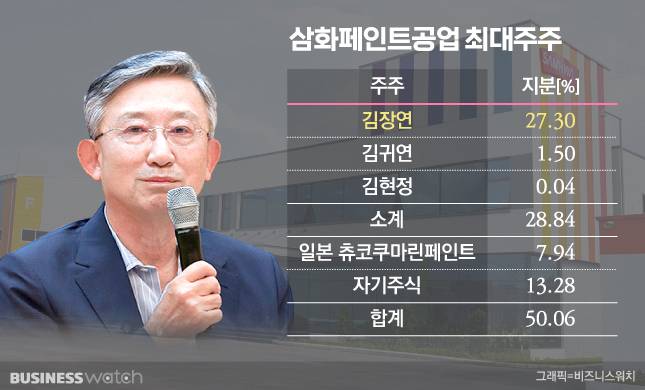 다만 김 상무의 경영 행보에 비해 상대적으로 지분 승계는 무척 더딘 편이다. 즉, 지주회사격인 삼화페인트공업㈜에 대한 김 상무의 지분이 거의 없다시피 하다. 2019년 7월 장내에서 5000만원 남짓에 산 0.04%가 전부다. 김 회장이 현 지분 27.03% 최대주주로서 변함없이 절대권력을 쥐고 있다는 뜻이다. 장남은 아예 단 한 주도 없다.