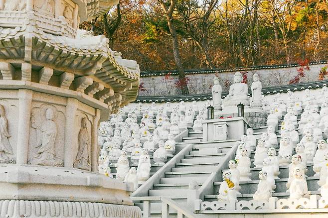 석실과 오백나한, 너비 13.5m, 높이 2m의 와불을 모시고 있는 와불전도 빠트릴 수 없는 공간. 천연 동굴을 이용한 석실의 경우, 신라 선덕여왕 4년에 회정대사가 처음 건립하고 조선 순조 12년(1812)에 다시 고쳐 지은 석굴사원이다. 보문사가 자연을 활용하는 또 다른 방법이다.