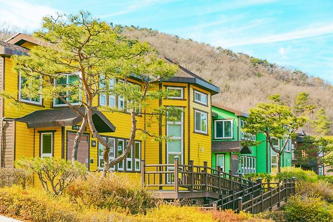 이곳은 휴양관과 숲속의 집, 두 개 콘셉트로 구성돼 있다. 휴양관은 콘도형으로 4인실과 10인실이 준비돼 있고, 상봉산 전망대, 산책로, 상봉산, 휴양림 쉼터 등이 있다. 자연 속에 숙소가 쏙 들어가 있는 형태다. 바다가 살짝 보이는 것도 휴양관의 장점이다. 알뜰살뜰 다양한 매력이 모여 있어 충분히 하루 머무를 만하다. 다음은 독채형인 숲속의 집이다. 과장 조금 보태서 마치 샌프란시스코의 동네를 보는 것 같다. 어깨를 맞댄 형형색색의 주택들처럼 숲속의 집도 원색의 숙소들이 자연과 조화를 이루고 있다. 숲속의 집은 6명부터 22명까지 수용할 수 있는 객실이 있으며, 족구장 같은 시설도 갖추고 있어 여러 명의 모임도 거뜬하다. 석모도 수목원이 코앞에 있는 것도 강점이다.