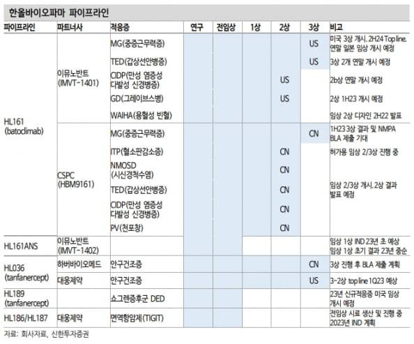 HL161의 임상 개발 불확실성은 해소됐다는 판단이다. 한올바이오파마는 미국 협력사인 이뮤노반트를 통해 피하주사(SC) 제형의 ‘FcRn’ 저해제 HL161를 개발하고 있다. 이뮤노반트는 부작용 문제로 중단됐던 HL161의 임상을 재개하고 있다. 전신성중증근무력증(gMG)의 미국 3상을 시작했고, 연말까지 갑상선안병증(TED) 3상 2건과 염증성 탈수초성 다발성신경병증(CIDP) 2b상을 개시할 예정이다.