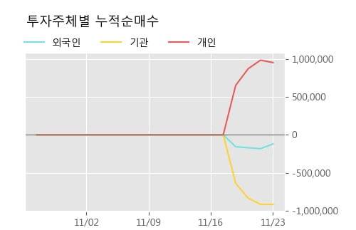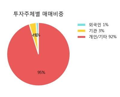 지난 한달을 기준으로 보면 외국인이 12.0만주를 순매도했고, 기관도 91.7만주를 순매도했지만, 개인은 오히려 95.3만주를 순매수했다. 같은 기간, 개인의 거래 비중이 92.4%로 가장 높아, 이 종목의 주요 거래 주체는 개인이었음을 알 수 있다.