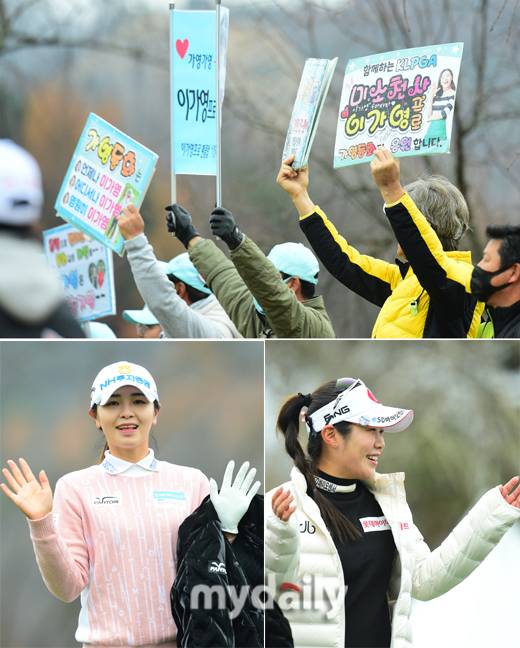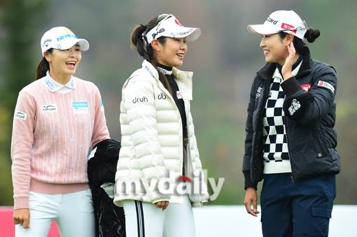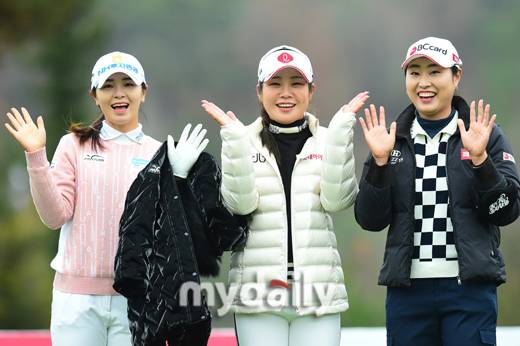 갤러리들의 응원속에 티샷을 마친 이가영, 이소영, 김우정은 포즈를 취하기 전 이야기를 나누며 약간은 어정쩡한 포즈를 취했다.