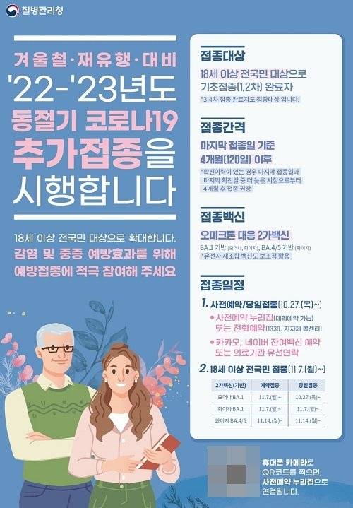 접종 백신은 2가백신(화이자·모더나)이다. 예방접종 사전예약 시스템 누리집 온라인 예약 또는 질병청 콜센터로 전화해 예약할 수 있다. 예약 없이 카카오톡·네이버 앱에서 잔여 백신 확인 후 의료기관에 별도로 연락해 당일 접종을 받아도 된다.