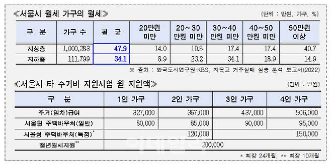 반지하 특정바우처 지원금액(월 20만원)은 서울시 월세 가구 중 지하·지상층에 거주하는 가구의 평균월세 차액(13만 8000원)과 타 주거 복지 사업을 다방면으로 고려해 산정했다.