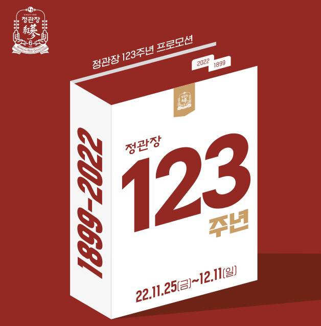 KGC인삼공사는 창업 123주년을 기념, 고객들에게 감사한 마음을 담아 다양한 혜택을 제공한다. 123주년의 의미로 정관장 제품 10/20/30만원을 구매한 정관장 멤버스에게 1/2/3만원의 혜택이 담긴 쿠폰을 제공하는 '123 숫자 이벤트'를 진행한다. 정관장 홍삼의 대표제품인 홍삼정(240g), 홍삼톤골드(30포)를 구매한 고객에게는 2023년 설명절에 현금처럼 사용이 가능한 정관장 포인트 1만점을, 정관장 제품 10만원 이상 구매한 신규 멤버스 고객에게도 1만점의 포인트를 제공한다.