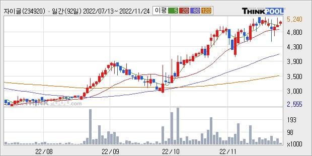 '자이글' 52주 신고가 경신, 단기·중기 이평선 정배열로 상승세
