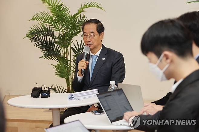 (서울=연합뉴스) 김승두 기자 = 한덕수 국무총리가 24일 정부서울청사에서 출입 기자들과 만나 백브리핑을 하고 있다. 2022.11.24