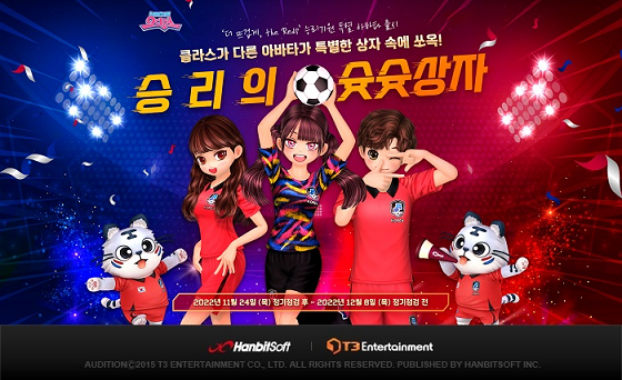 한빛소프트는 PC 온라인 스타일리시 리듬댄스게임 '오디션'에서 유저들과 함께 대한민국 축구 국가대표팀을 응원하는 이벤트 '짜릿한 승부의 세계! 승리를 예측하라'를 마련했다.