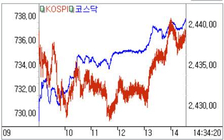 코스피 장 중 2440 터치…외인·기관 동반 '사자'