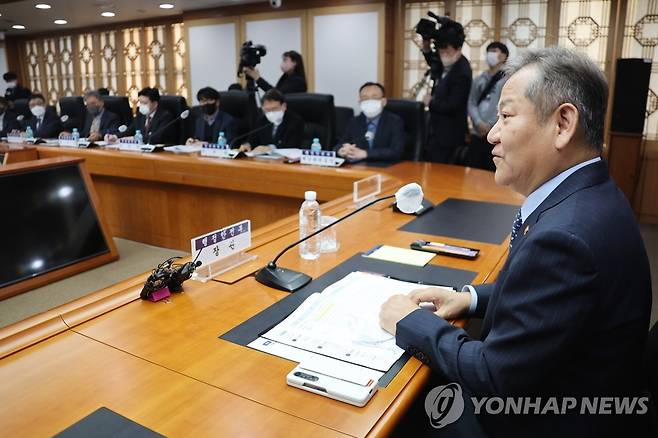 (서울=연합뉴스) 김승두 기자 = 이상민 행정안전부 장관이 24일 정부서울청사에서 열린 기후변화 대비 재난관리체계 개선 전문가 자문회의를 주재하고 있다. 2022.11.24
