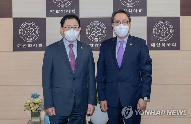 (서울=연합뉴스) 박민수 보건복지부 2차관(오른쪽)이 24일 서울 서초구 대한약사회를 방문, 최광훈 대한약사회장과 기념 촬영하고 있다. 2022.11.24 [보건복지부 제공. 재판매 및 DB 금지]