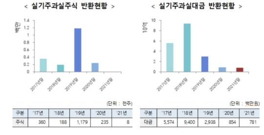 최근 5년간 예탁결제원은 실기주주에게 실기주과실주식 약 197만주, 실기주과실대금 약 195.5억원을 지급했다.