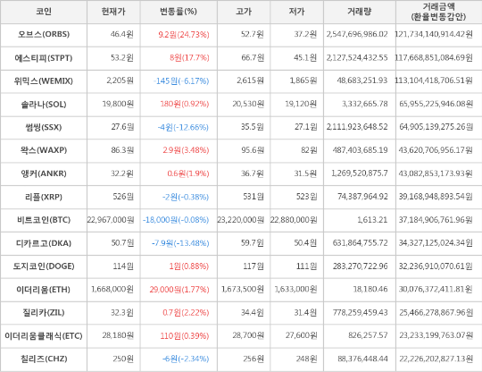 또한, 썸씽(-12.66%, 27.6원), 위믹스(-6.17%, 2,205원), 칠리즈(-2.34%, 250원), 리플(-0.38%, 526원)이 하락세를 나타냈다.