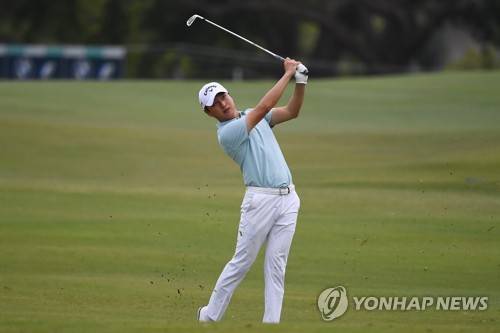 epa10324111 Jeunghun Wang plays a shot during Round 1 of the 2022 Fortinet Australian PGA Championship at the Royal Queensland Golf Club in Brisbane, Australia, 24 November 2022. EPA/JONO SEARLE AUSTRALIA AND NEW ZEALAND OUT