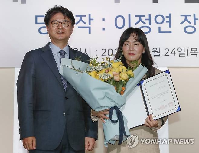 (서울=연합뉴스) 진성철 기자 = 24일 서울 종로구 연합뉴스 사옥에서 열린 수림문학상 시상식에서 이정연 소설가(오른쪽)가 성기홍 연합뉴스 사장으로부터 수상 증서를 받고 있다. 연합뉴스와 수림문화재단은 이정연의 장편소설 '속도의 안내자'를 수림문학상 제10회 당선작으로 선정했다. 2022.11.24