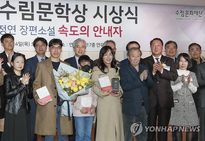 (서울=연합뉴스) 진성철 기자 = 24일 서울 종로구 연합뉴스 사옥에서 열린 수림문학상 시상식에서 수상자인 이정연 소설가(가운데)가 최규학 수림문화재단 이사장, 성기홍 연합뉴스 사장 등 참석자들과 함께 기념 촬영을 하고 있다. 연합뉴스와 수림문화재단은 이정연의 장편소설 '속도의 안내자'를 수림문학상 제10회 당선작으로 선정했다. 2022.11.24