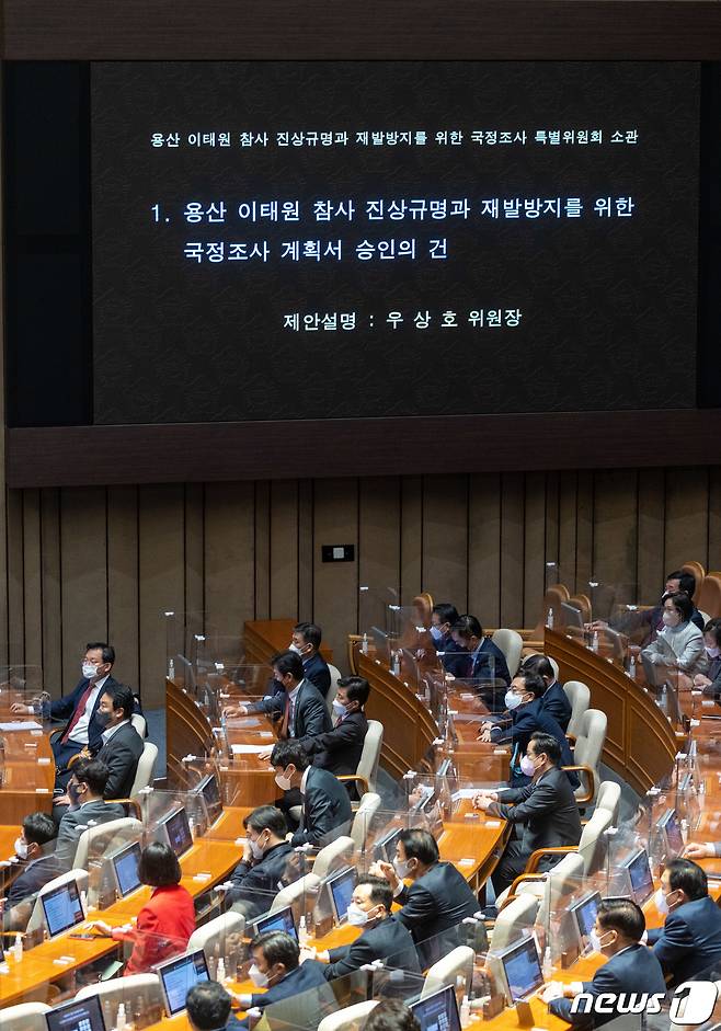 (서울=뉴스1) 이재명 기자 = 24일 오후 서울 여의도 국회에서 열린 제400회 국회(정기회) 제13차 본회의에서 용산 이태원 참사 진상규명과 재발방지를 위한 국정조사 계획서 승인의 건이 상정되고 있다. 2022.11.24/뉴스1