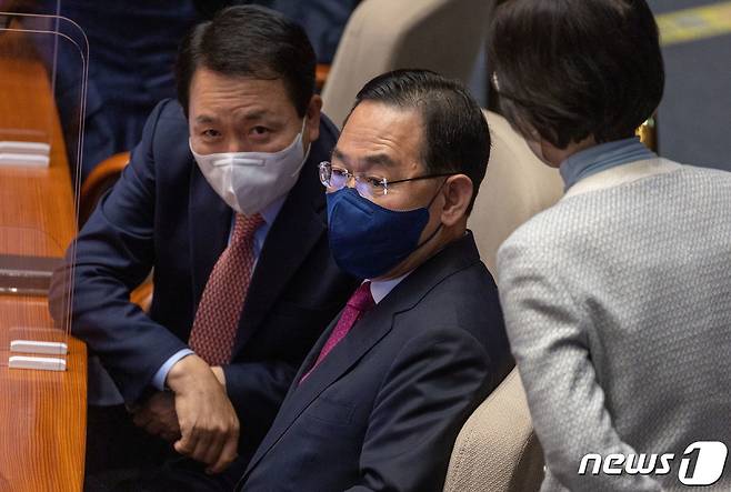(서울=뉴스1) 이재명 기자 = 주호영 국민의힘 원내대표와 성일종 정책위의장이 24일 오후 서울 여의도 국회에서 열린 제400회 국회(정기회) 제13차 본회의에서 대화를 하고 있다. 2022.11.24/뉴스1