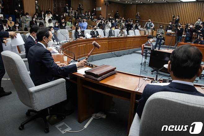 (서울=뉴스1) 유승관 기자 = 우상호 국회 용산 이태원 참사 진상규명과 재발방지를 위한 국정조사 특별위원회 위원장이 24일 서울 여의도 국회에서 열린 특별위원회 첫 회의에서 의사봉을 두드리고 있다. 2022.11.24/뉴스1