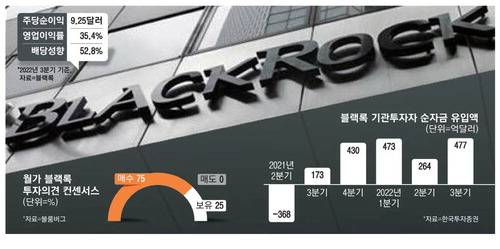 백두산 한국투자증권 연구원은 "블랙록의 3분기 운용자산(AUM)은 펀드수익률 부진과 달러 강세에 따른 영향으로 전 분기 대비 6% 감소한 8조달러를 기록했다"면서도 "단기성 자금은 순유출됐지만 장기 자금 순유입이 받쳐준 점은 고무적"이라고 말했다.