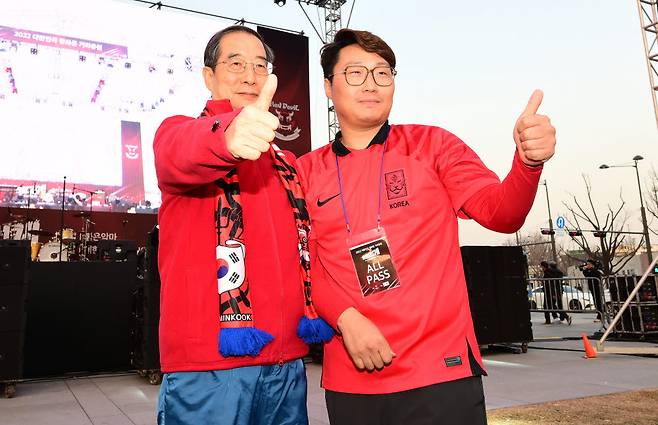 2022 카타르월드컵 대한민국과 우루과이의 조별예선 첫 경기일인 24일 서울 광화문광장에서 거리 응원이 예정된 가운데 현장 안전점검에 나선 한덕수 국무총리가 조호태 붉은악마 서울지부장으로부터 붉은악마 머플러를 받고 있다.