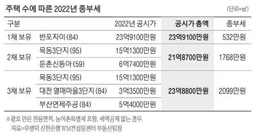 우병탁 신한은행 WM컨설팅센터 부동산팀장의 모의 계산에 따르면, 공시가 23억원대 서울 반포자이를 1채 보유한 사람은 종부세로 532만원을 내지만, 공시가 총합이 21억원대인 서울 소재 아파트 두 채를 보유한 사람은 종부세로 1768만원을 낸다. 서울과 지방 아파트를 포함해 비슷한 공시가여도 3채를 보유한 사람은 종부세가 2099만원으로 더 불어난다.