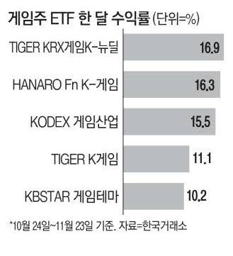 24일 한국거래소에 따르면 게임주에 투자하는 ETF 5종의 지난달 24일부터 이달 23일까지 최근 한 달 평균 수익률은 14%를 기록했다. 같은 기간 코스피 상승률(약 8%)을 훌쩍 뛰어넘은 것이다.
