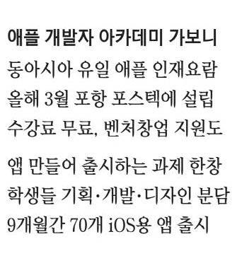 지난 3월 처음 문을 연 애플 디벨로퍼 아카데미는 총 9개월의 수강 과정을 마무리 짓고 다음달 16일 종료된다. 모든 수강생에게 아이폰과 맥북이 지급되며 수강료도 무료다. 공정거래위원회 동의의결 과정에서 애플이 제출한 상생 지원 방안의 일환으로 한국 개발자와 중소기업, 학생을 지원하기 위해 국내 설립이 추진됐다. 애플 디벨로퍼 아카데미는 미국 디트로이트와 이탈리아 나폴리, 브라질 등 전 세계 17곳에서 운영되고 있으며 한국에서는 동아시아 가운데 첫 번째로 세워졌다.
