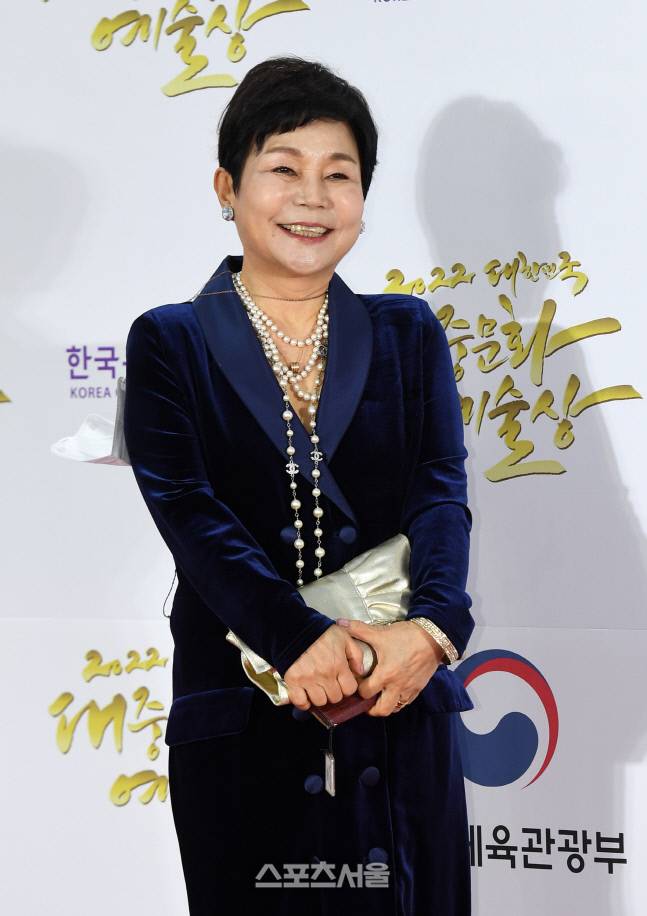 성우 홍승옥이 24일 서울 중구 국립극장 해오름극장에서 진행된 ‘2022 대한민국 대중문화예술상’ 시상식에 앞서 행사장으로 입장하면서 취재진을 향해 포즈를 취하고 있다. 2022. 11. 24.