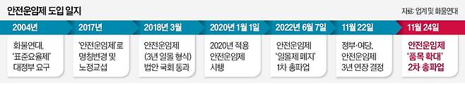 경제계는 안전운임제가 과태료(1000만원)를 화주에게 부과하는 점에 특히 반발하고 있다. 정 부회장은 “유럽화주협의회(ESC)와 세계화주연합(GSA)이 각각 한국의 안전운임제로 화주가 과태료 대상이 된다는 점에 대해 우려하는 의견을 보내왔다”며 “한국 산업 경쟁력이 떨어지면 결국 (파업 중인) 화물차 소유주들이 피해를 볼 것”이라고 강조했다.