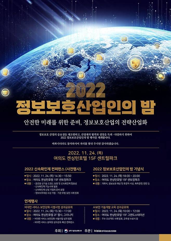이날 연계행사로는 과기정통부가 정보보호산업 육성을 위해 운영 중인 다양한 사업들의 성과공유회로서 'AI 보안 기술 개발 교육 성과 발표회'와 '2022년 비대면 서비스 보안강화 시범사업 성과 공유회'가 같은 날 진행됐다. 오는 12월8일에는 'AI 보안 컨퍼런스'가 개최될 예정이다.