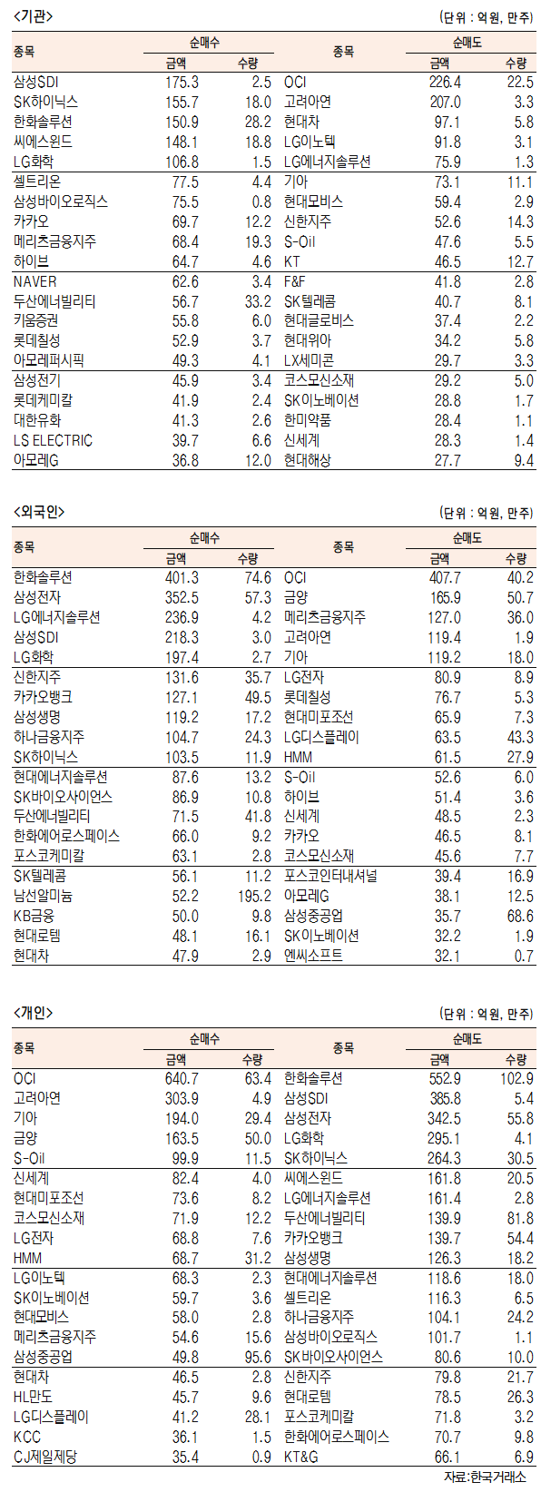 - [데이터로 보는 증시]코스피 기관·외국인·개인 순매수·순매도 상위종목(11월 23일-최종치)