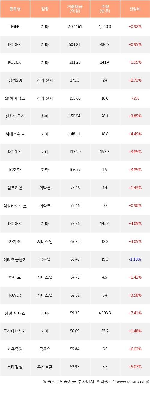 기관 투자자의 순매수 상위 20개 종목은 TIGER MSCI Korea TR, KODEX 200TR, KODEX 레버리지, 삼성SDI, SK하이닉스, 한화솔루션, 씨에스윈드, KODEX 코스닥150레버리지, LG화학, 셀트리온등이다.