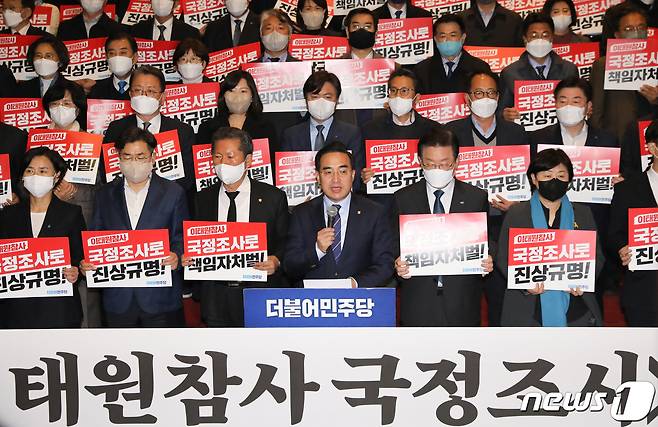 (서울=뉴스1) 허경 기자 = 박홍근 더불어민주당 원내대표가 24일 서울 여의도 국회에서 열린 이태원 참사 국정조사 범국민서명운동 보고대회에서 발언하고 있다. 2022.11.24/뉴스1