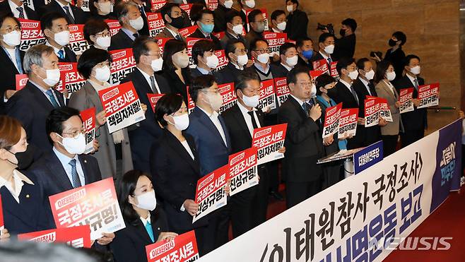 [서울=뉴시스] 고범준 기자 = 이재명 더불어민주당 대표가 24일 오후 서울 여의도 국회 로텐더홀 앞 계단에서 열린 '이태원참사 국정조사 범국민서명운동 보고'에서 발언을 하고 있다. 2022.11.24. bjko@newsis.com