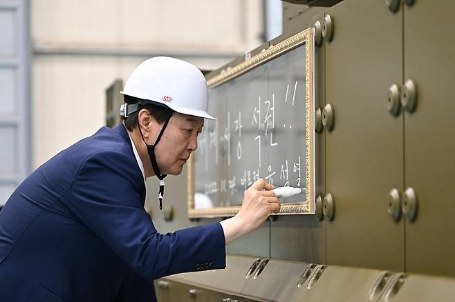 [창원=뉴시스] 윤석열 대통령이 24일 오후 경남 창원 한화에어로스페이스를 방문해 보병전투장갑차 레드백에 사인하고 있다. (사진=대통령실 제공) 2022.11.24. photo@newsis.com *재판매 및 DB 금지